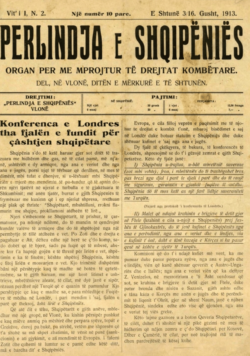 The first issue of Perlindja e Shqipëniës was released on August 24, 1913 and its chief editor was Dhimitër Beratti,
