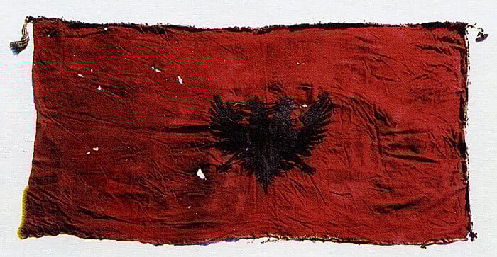 Early Albanian flag from the collection of Ekrem bey Vlora, now preserved at the Institute of Folk Culture in Tirana.